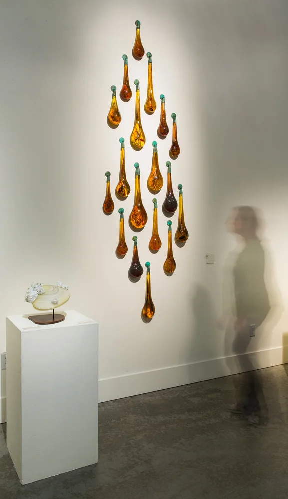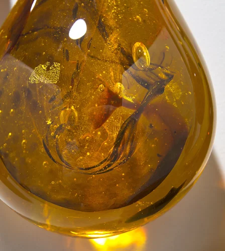 As many great scientists have noted, we study the past to be responsible in our future. The piece is titled “Remain,” which means both left behind and here to stay. Some “remains” in fact are visible inside the amber-colored glass, once you take a moment to really look into them. You’ll notice bug wings (replicated in glass), flecks and impurities, maybe a shell or likeness of a plant part, lots of veils and bubbles. Much of my work explores themes of “Momento Mori,” as well as extinction, preservation, and origin. I like the idea that in nature, amber has captured so many ancient remains from life in a time immemorial to humans, and preserved them in such a beautiful way.